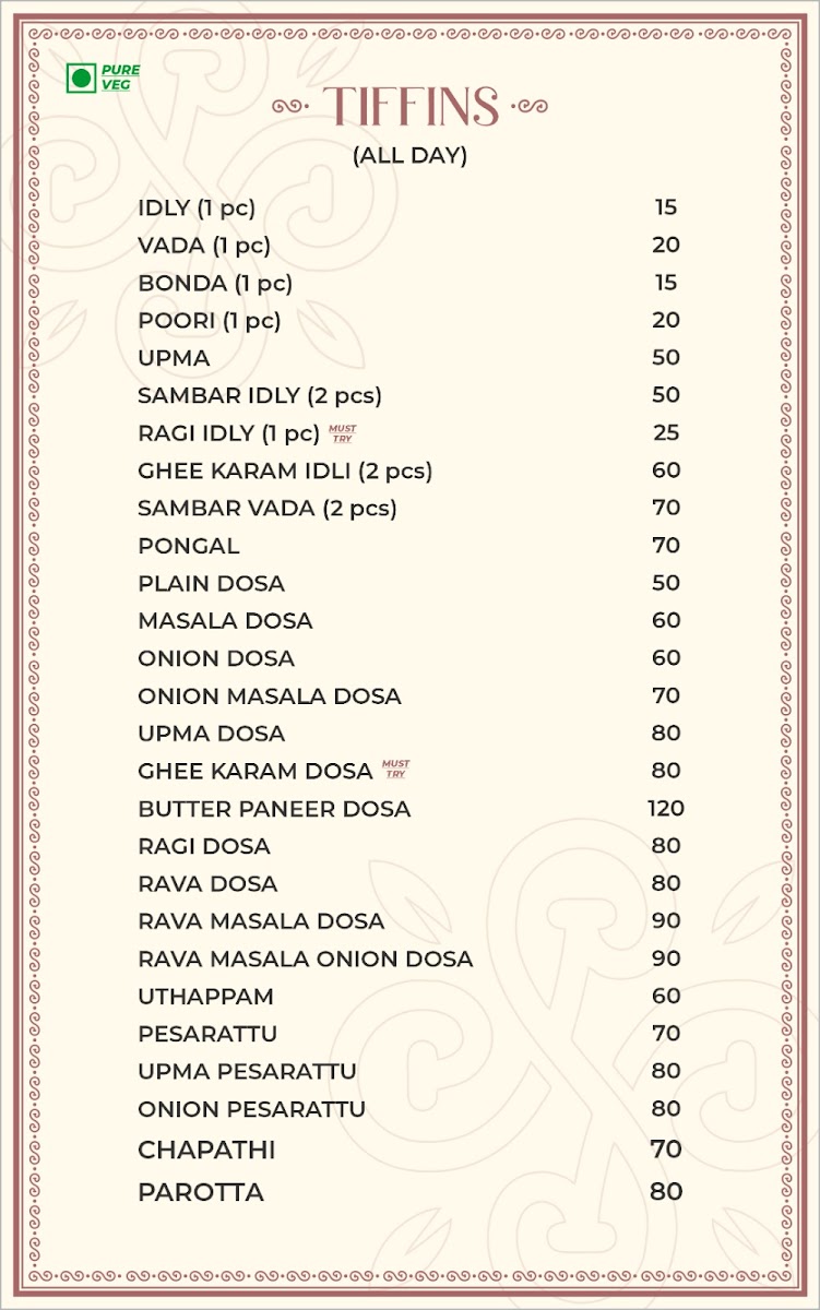 Highlights include the Ghee Karam Idli, with its rich spices, and the Masala Dosa, known for its perfect crispness. Additionally, their breakfast combo offers five varieties, making it a fantastic value at just ₹120. Pair your meal with refreshing beverages like Badam Milk or the aromatic Saffron Tea to complete your experience.